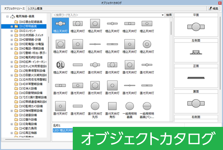をシンボル登録可能。図面に配置して一般照明と非常照明の照度分布図を作成したり、写真や