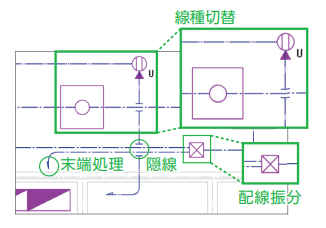 R付パターン配線や配線振分、隠線処理、配線の末端省略記号なども自動作画できます。