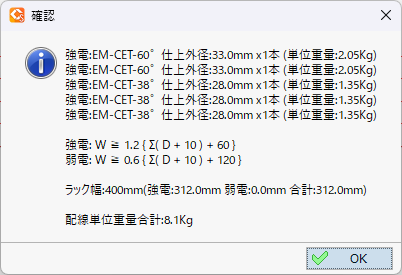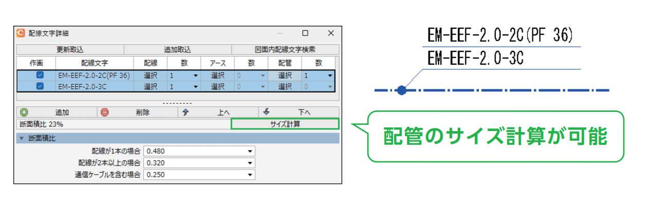 また、配線の断面積比に応じた適切なサイズの配管を算出し、配線に配線(ケーブル)・