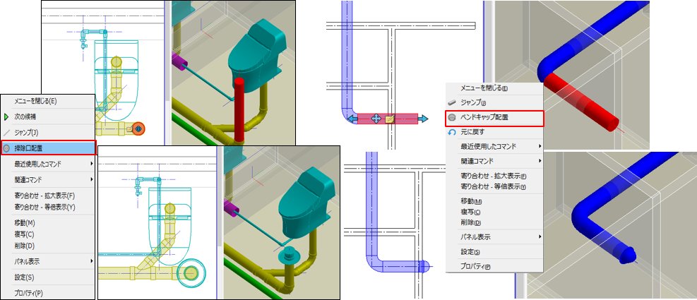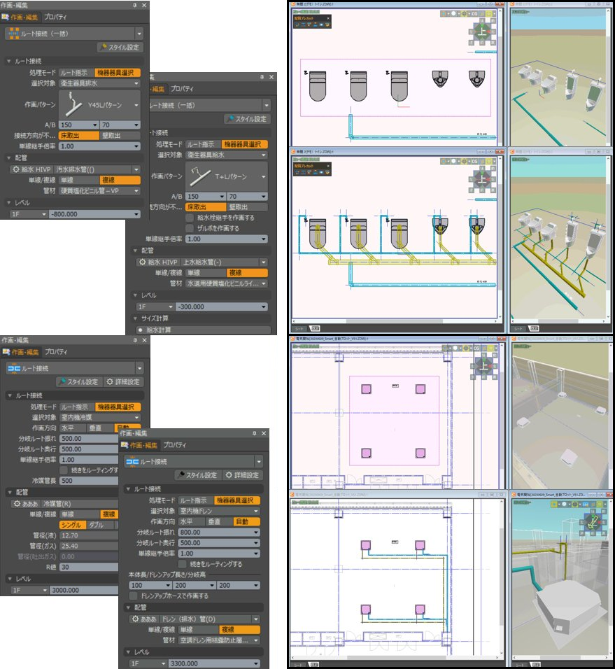 給水点や排汚水点から適切なサイズでの配管作画できます。