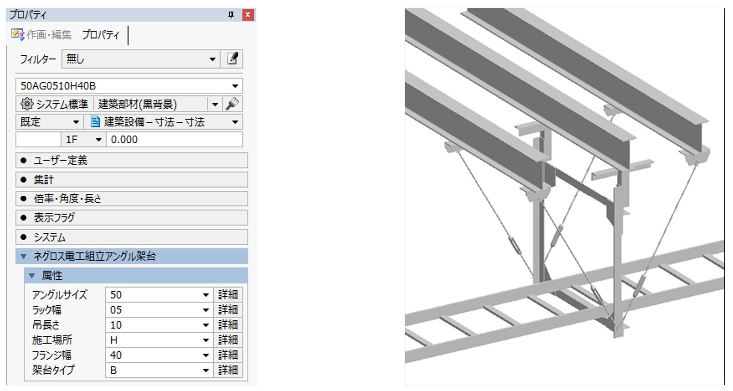 これを受け、「CADEWA Smart V7」では、ネグロス電工からの技術支援を受けてネグロス電工製のケーブルラック146部材を標準搭載し、積載重量からのラック幅計算機能、耐震地域係数・耐震種別・施工場所・ケーブル質量など必要条件入力による耐震基準に沿った組立アングル架台の選定機能も用意しました。これにより、手間のかかるケーブルラックの耐震支持検討の効率化に貢献します。